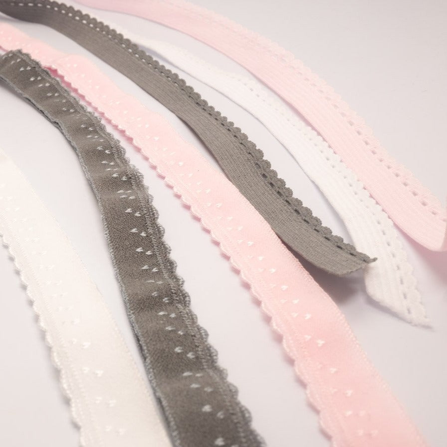 Élastique pré-plié pour réaliser des pièces de lingerie, des bloomers, des poignets froncés, des maillots de bain. Il se pose comme un biais à cheval pour prendre un tissu entre 2 épaisseurs.