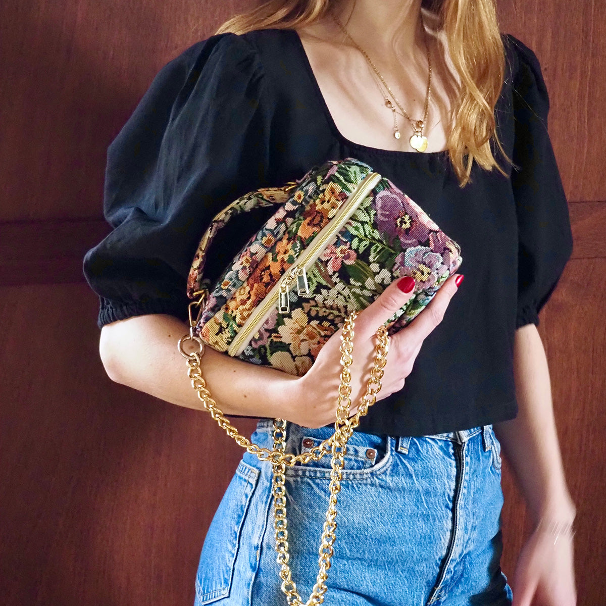 Ce kit couture comprend toutes les fournitures et le patron au format pochette pour réaliser la version petit sac avec bandoulière de Bristol avec ce joli jacquard jardin secret.