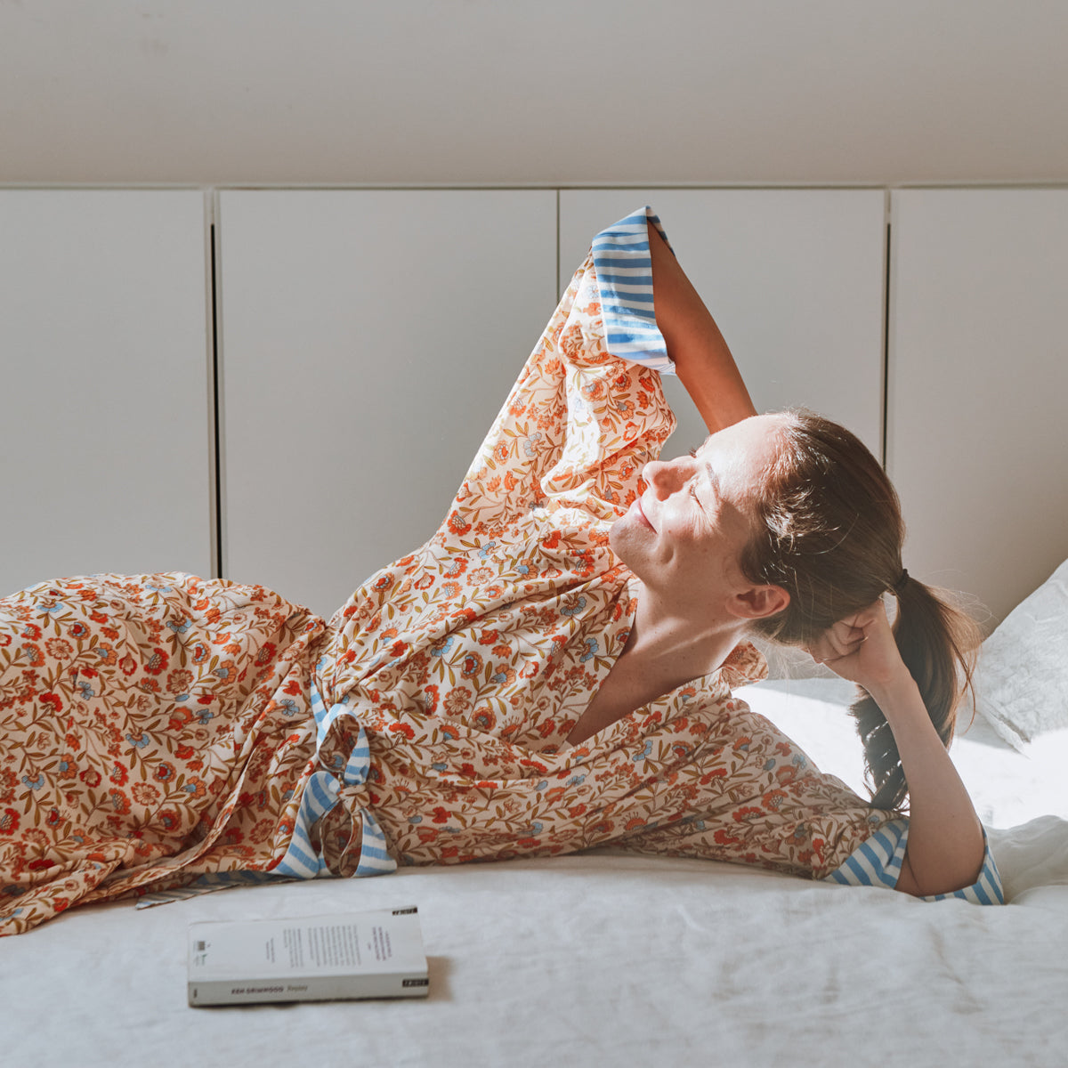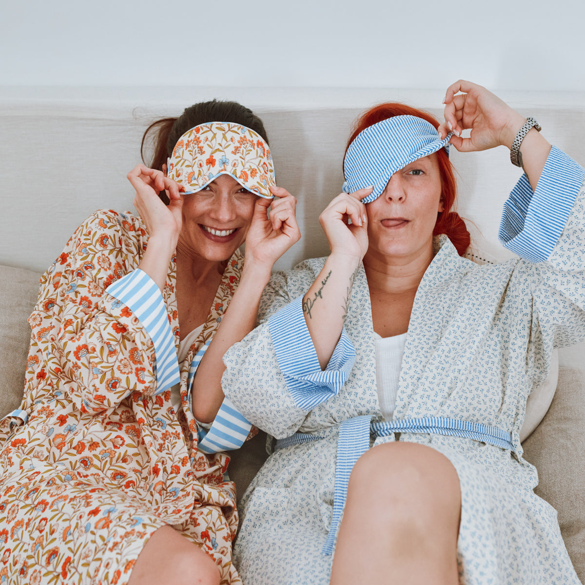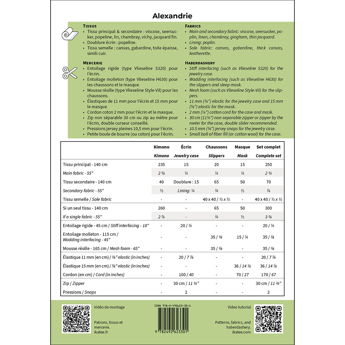 Alexandrie est un ensemble de 4 patrons pensés autour de l'univers de la chambre, pour la femme et l'homme : un kimono, des chaussons, un masque de sommeil et un écrin à bijoux. Les finitions sont soignées (coutures anglaises, rabattues, gansées, passepoilées) pour un résultat raffiné.