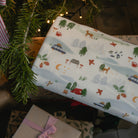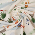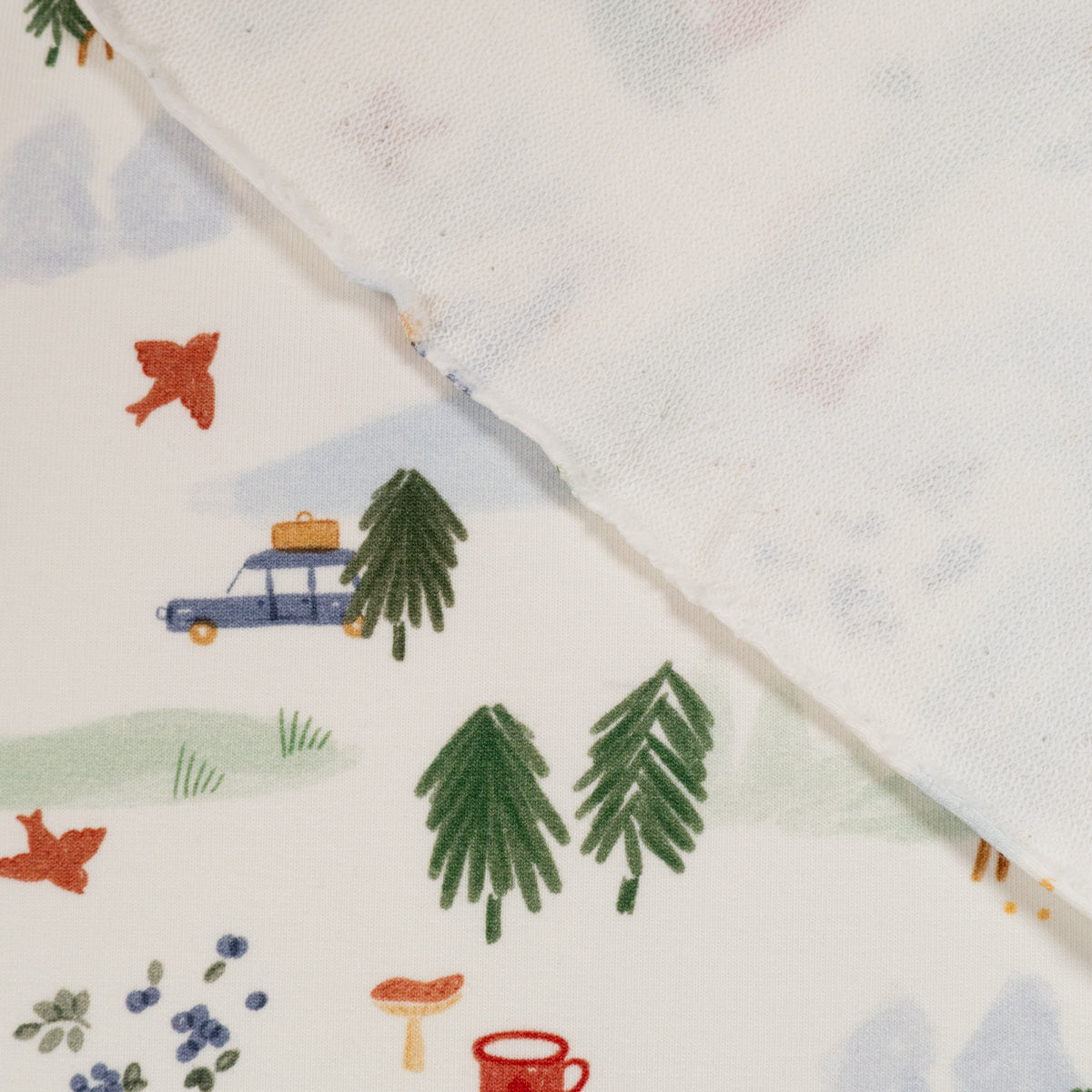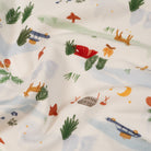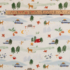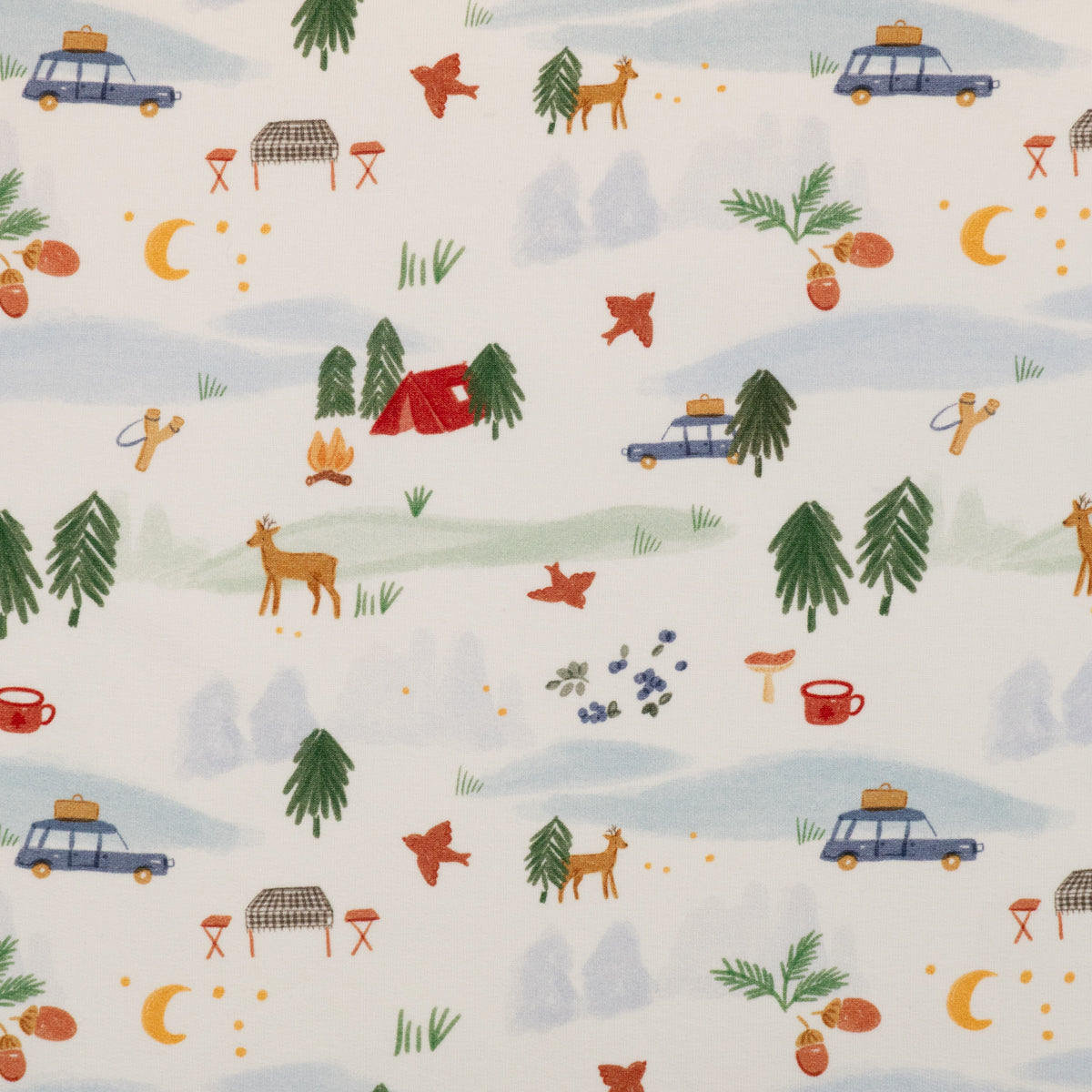 Coloris : fond blanc et motifs animaliers et évoquant le camping dans les tons vert, rouge, bleu et marron.