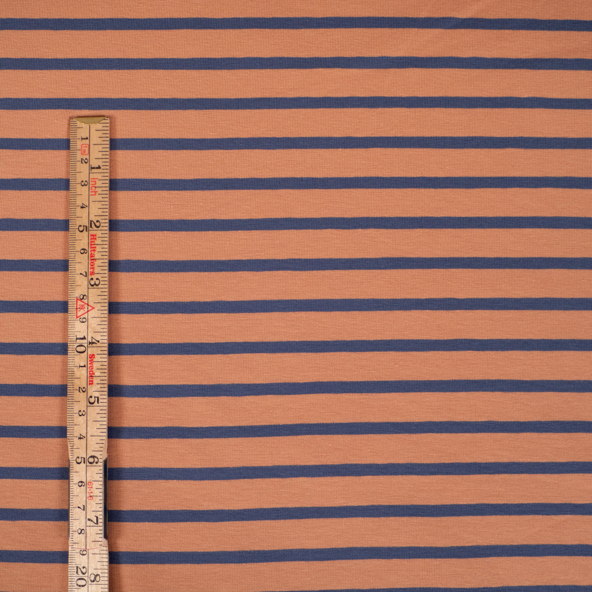 Coloris : Fond couleur cassonade, rayures bleu indigo.