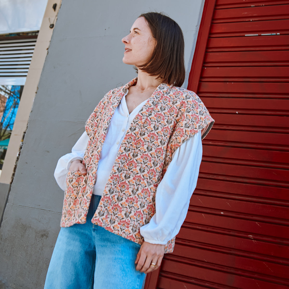 Inspirée du vestiaire minimaliste de la mode japonaise, Macao est une veste ou un gilet aux lignes épurées. Ce patron propose un volume ample avec des épaules descendues. Une bande d’encolure structure le vêtement et s’agrémente de boutons en option. C’est un projet rapide et plutôt simple à réaliser avec de jolies finitions ; les coutures rabattues permettent d’avoir des assemblages solides et élégants sur l’endroit comme sur l’envers et ceci rend la veste réversible si on utilise une matière jacquard ou un matelassé biface.