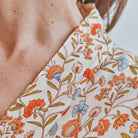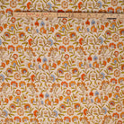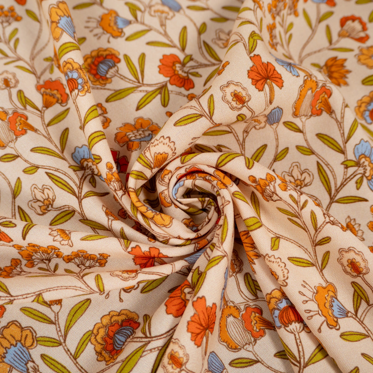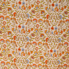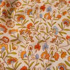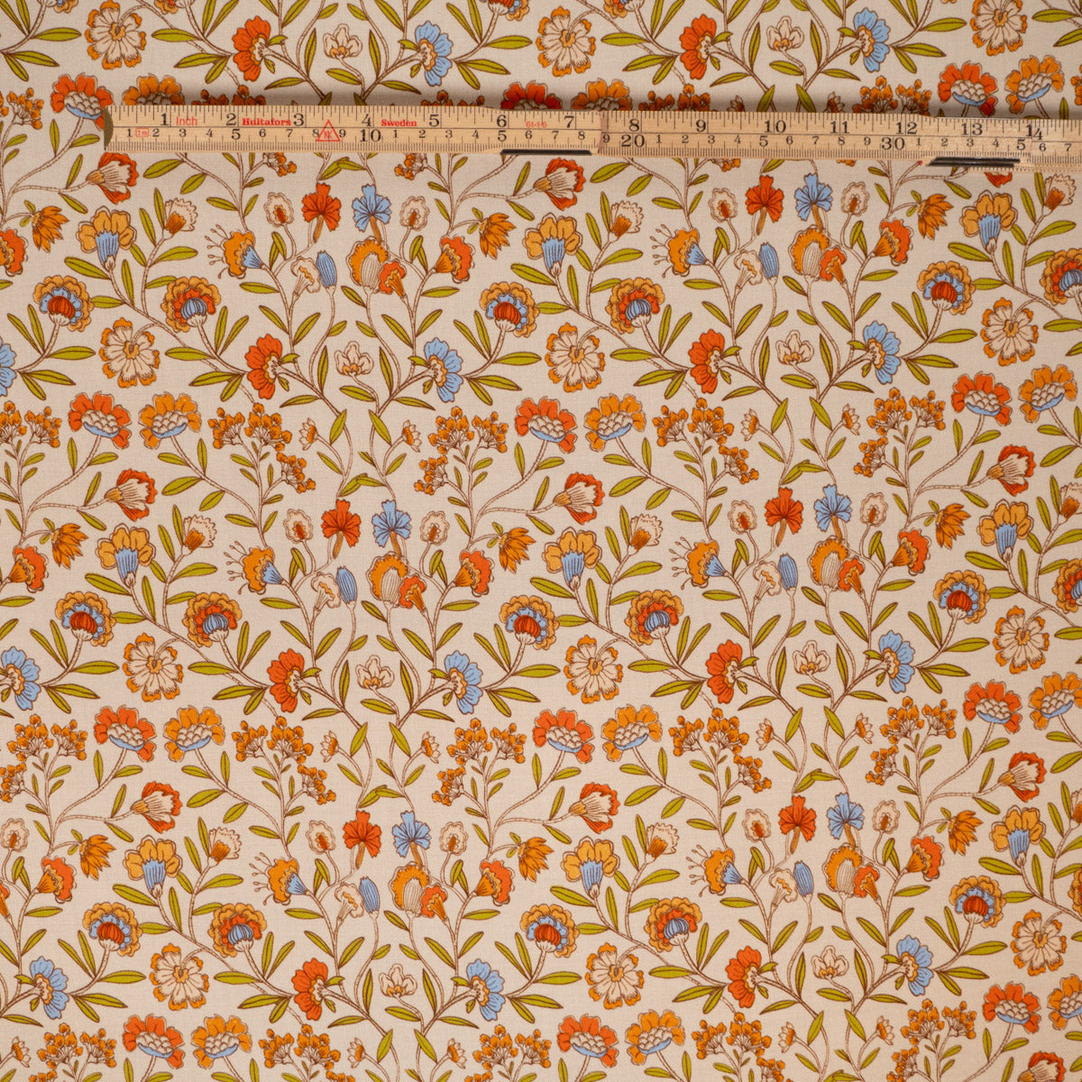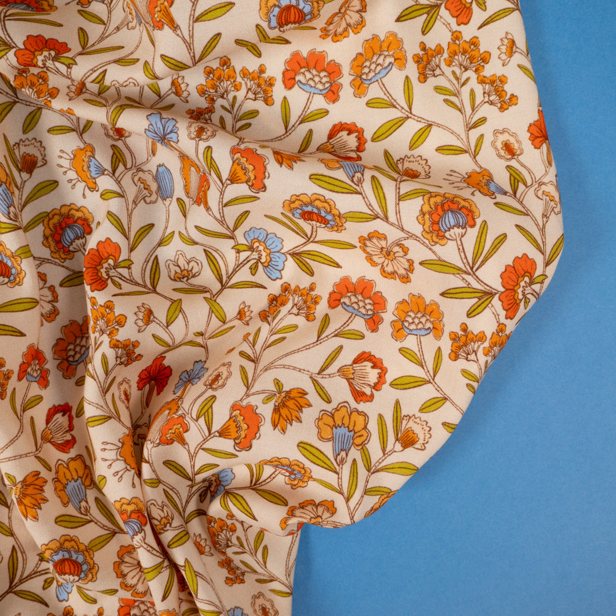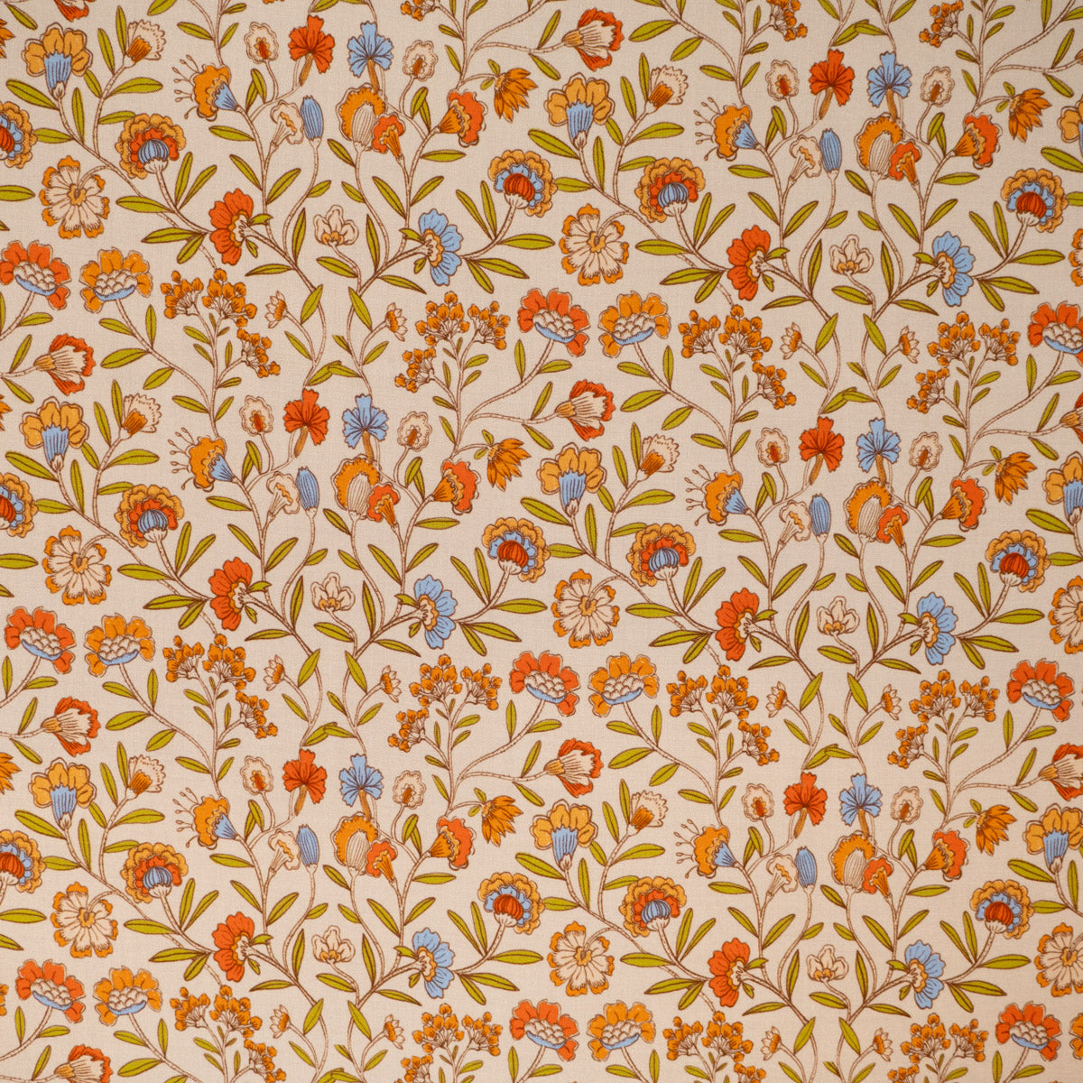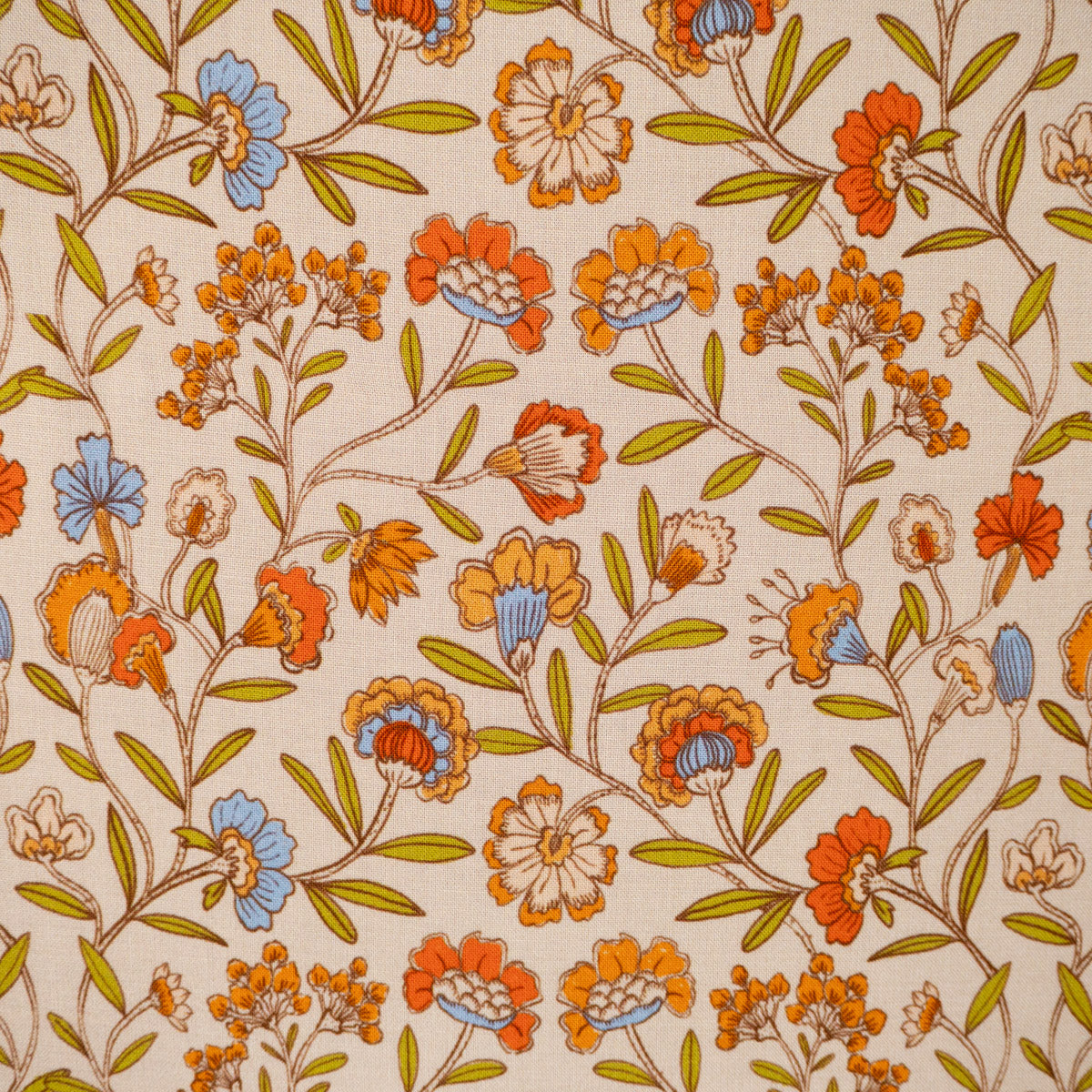 Coloris : fond écru (avec une teinte légèrement jaune), fleurs imprimées dans les tons orangés vert et bleu.