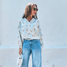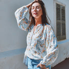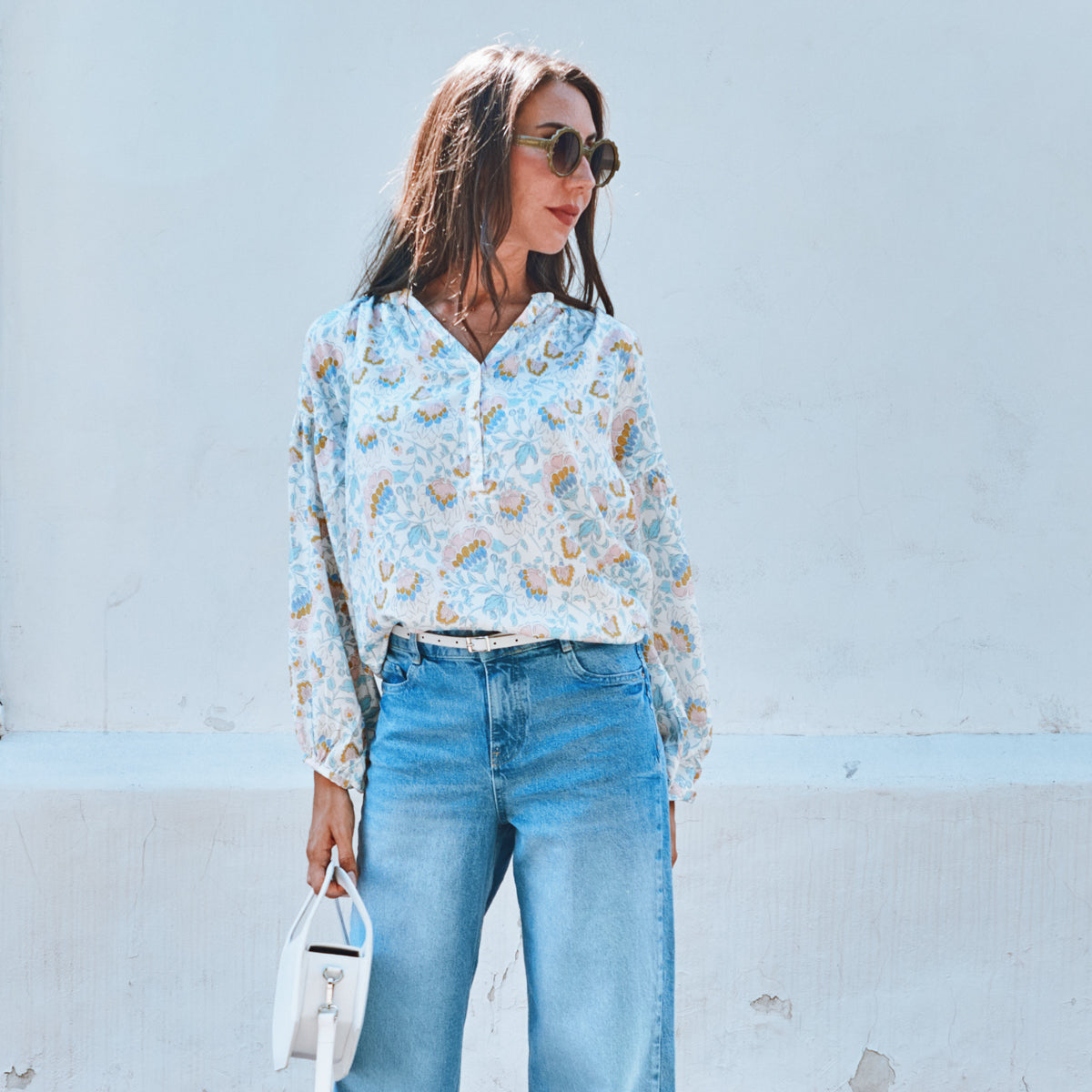 Coloris : fond bleu turquoise, fleurs imprimées.