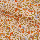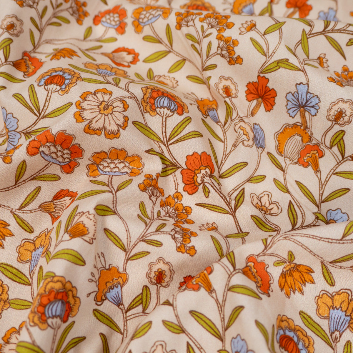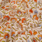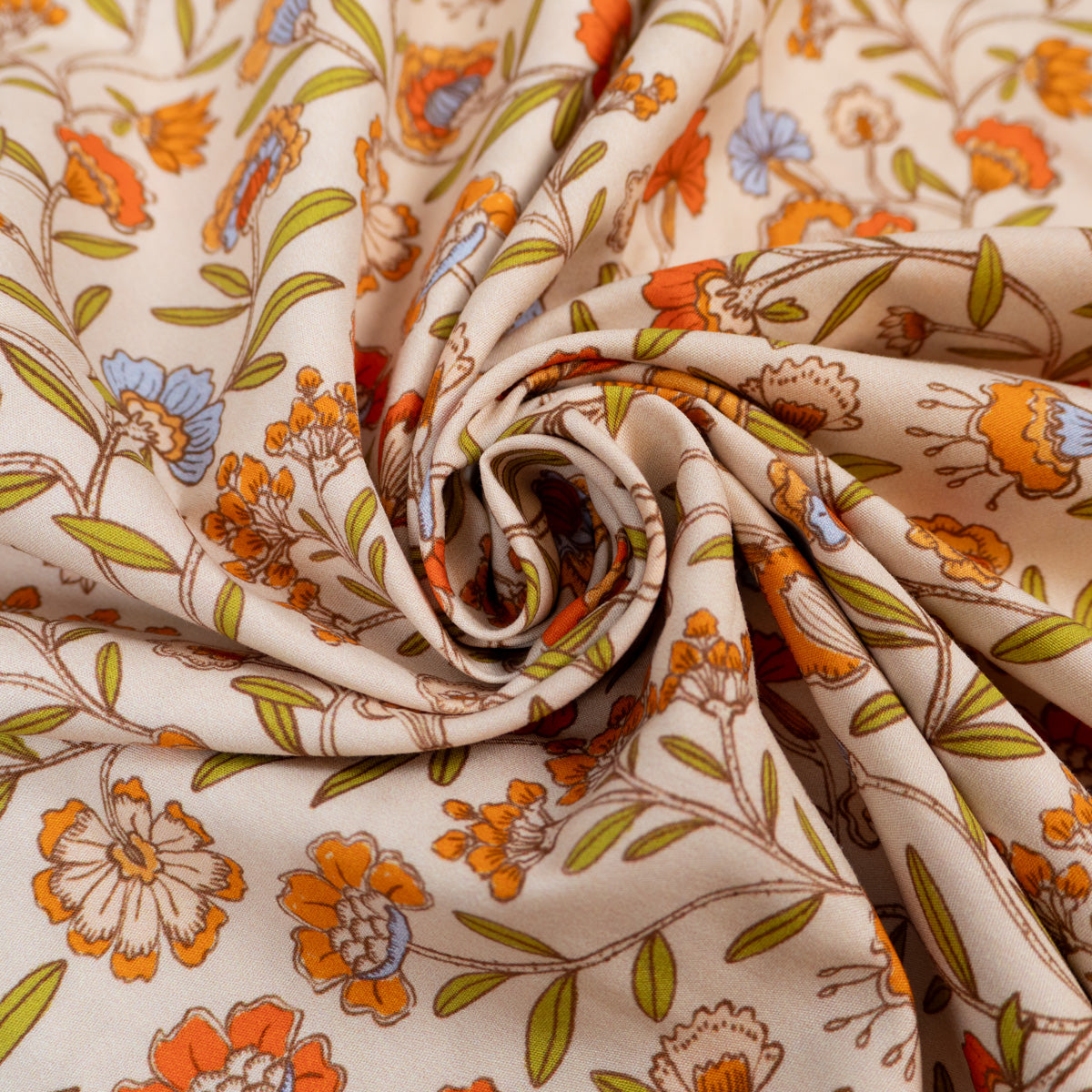 Farben: ecrufarbener Hintergrund und aufgedruckte Blumen.
