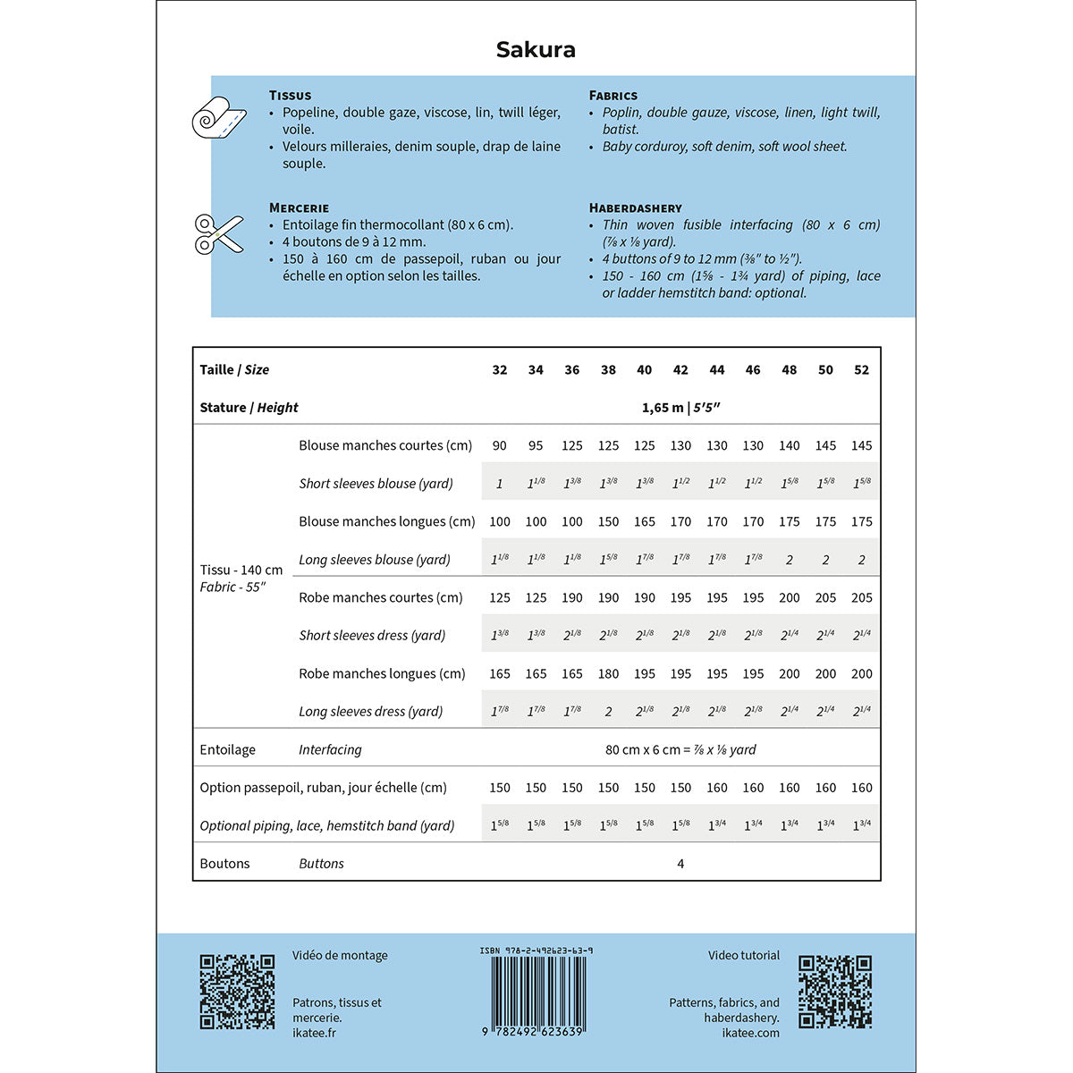 Sakura ist ein Blusen- und Kleiderschnittmuster für Damen. Dieses Modell kombiniert einen Bohème-Stil mit lockerer Passform. Es ist in zwei Längen erhältlich: Bluse oder Kleid (oberhalb des Knies). Es gibt außerdem zwei Ärmellängen (kurze Kimonoärmel oder lange Ärmel) und zwei Ausschnittarten (rund oder eckig). Die französischen Nähte und der gefütterte Latz sorgen für einen schönen Abschluss. Optional können Sie Spitze oder Paspeln in die Nähte einarbeiten.