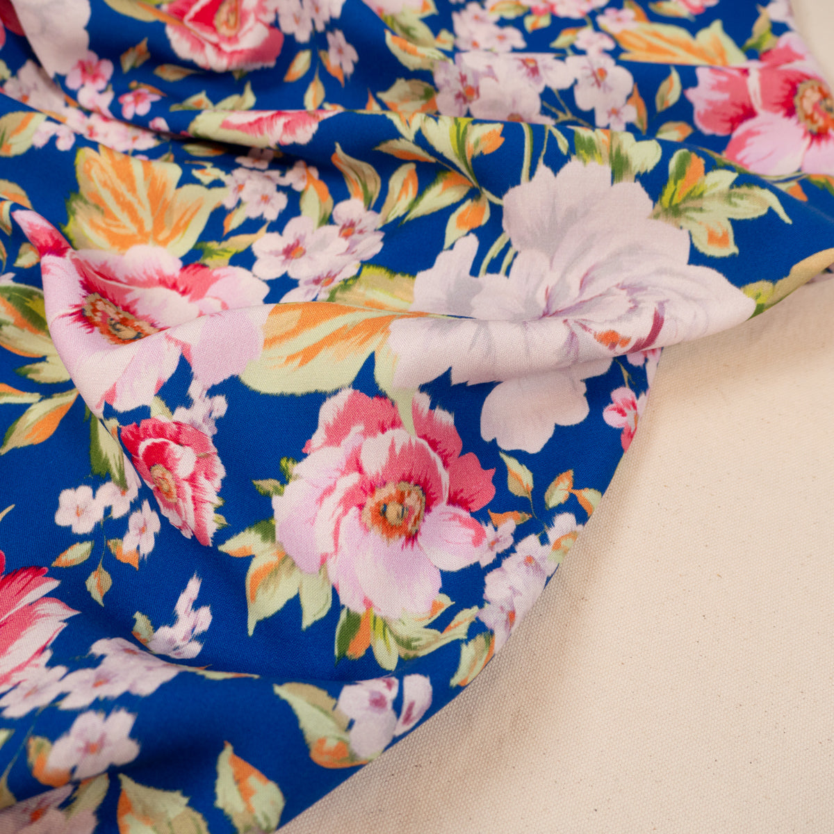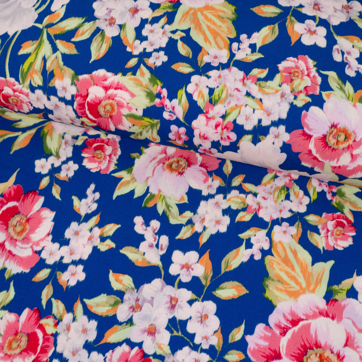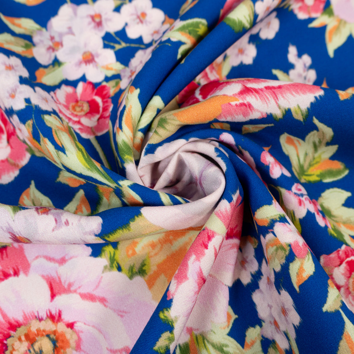 Farbgebung: elektrisches Blau als Grundfarbe, Blumenmuster in Rosatönen.