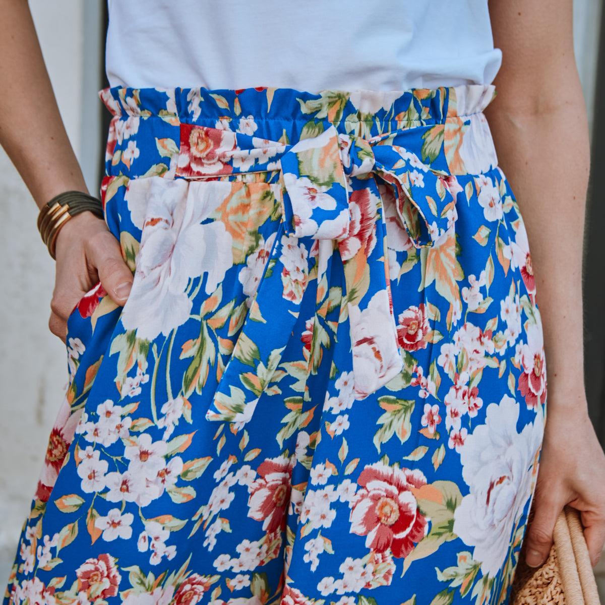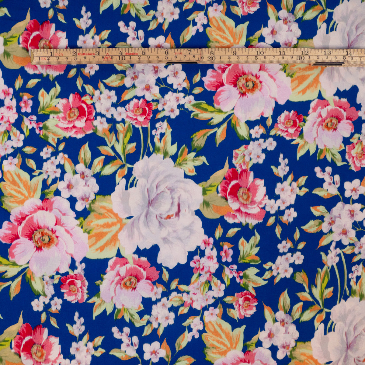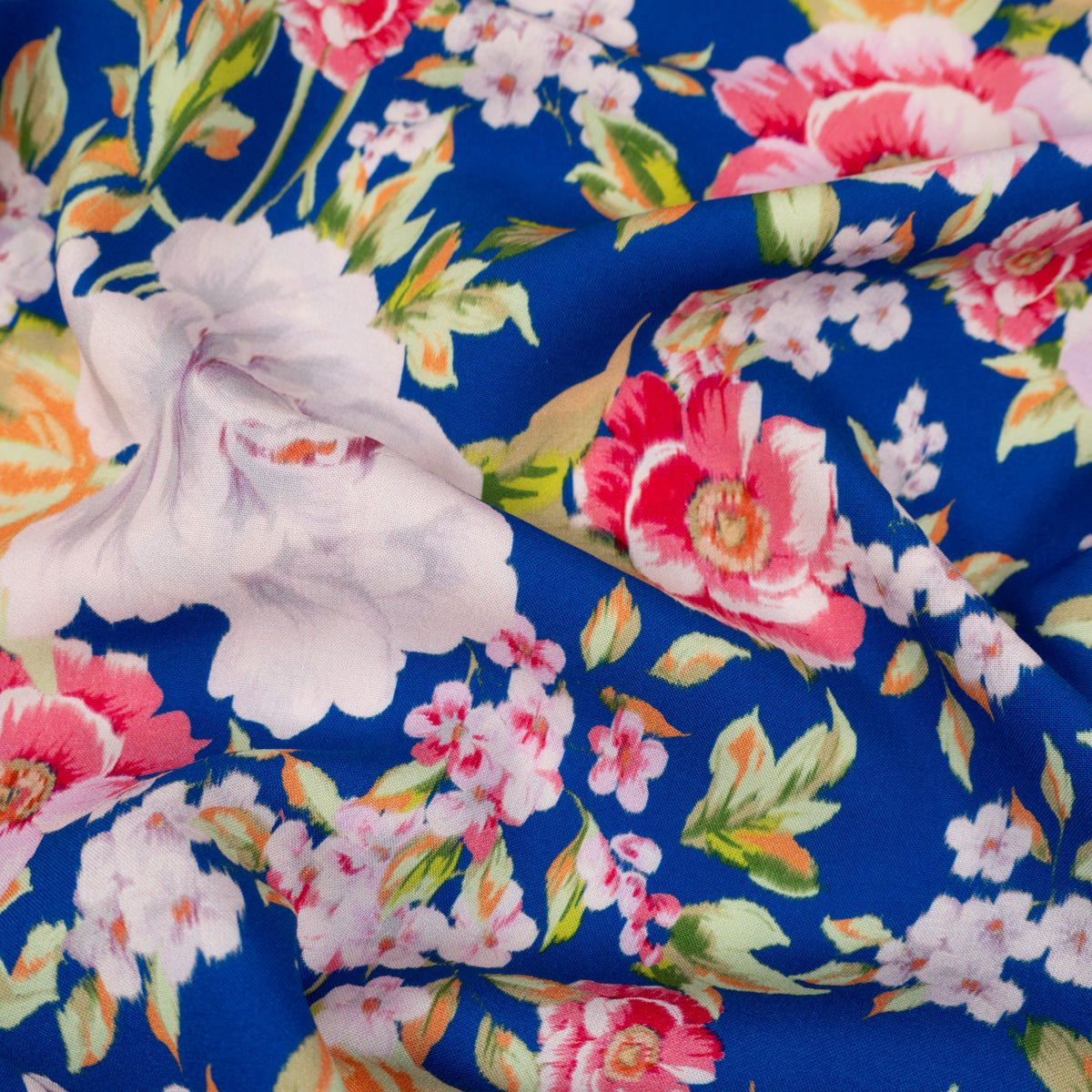 Farbgebung: elektrisches Blau als Grundfarbe, Blumenmuster in Rosatönen.