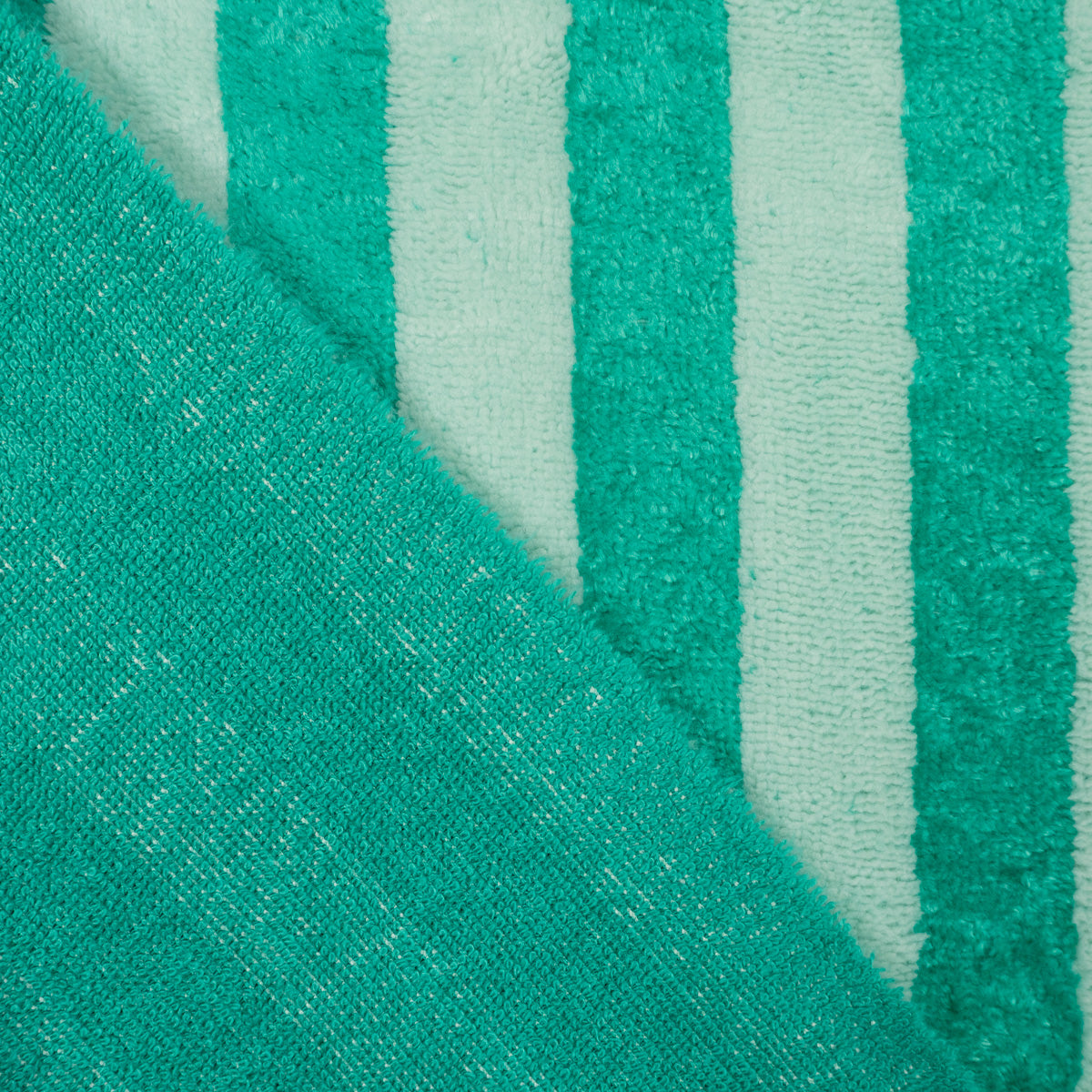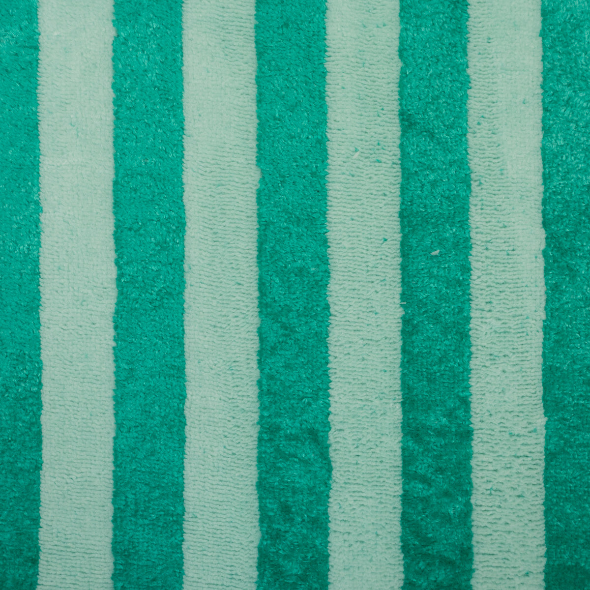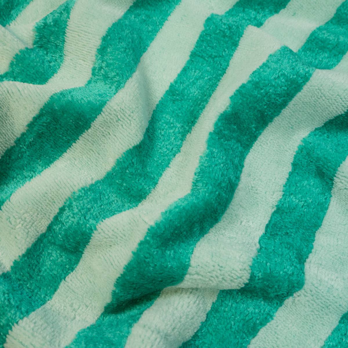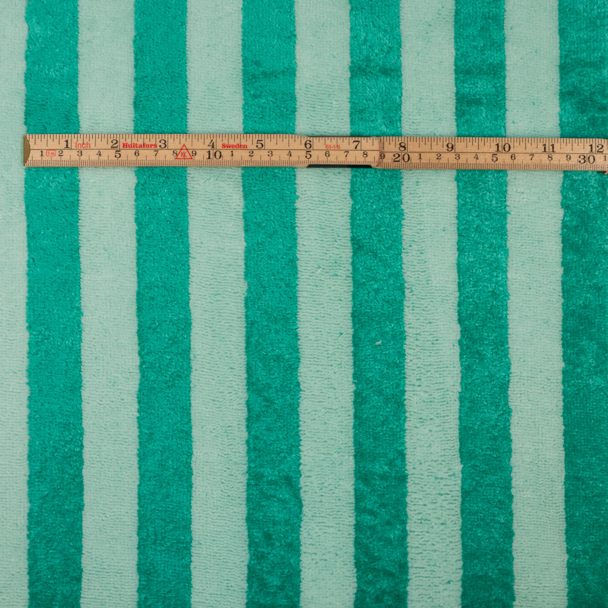 This micro-terry cloth is characterized by its extremely soft and plush texture, as well as its wide mint and emerald stripes. Its excellent absorbency makes it ideal for making makeup remover wipes, bathrobes, beach ponchos, bibs, sweatshirts, or pajamas.