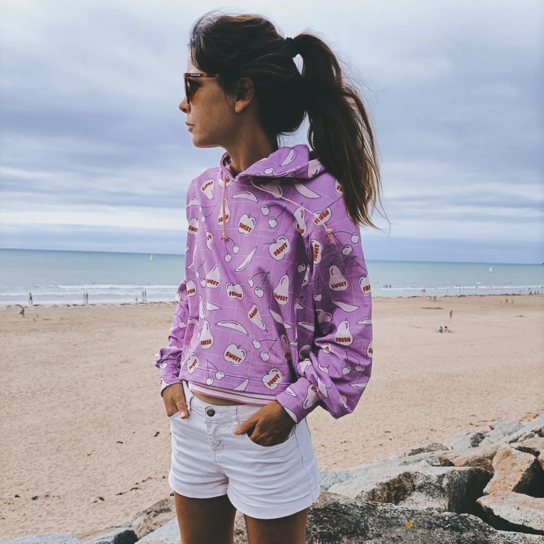 Vancouver is a women's sweatshirt pattern. It features a short length (below the waist) and a loose, oversized fit. This pattern can be made with a zippered front opening or as a classic hoodie without an opening. You can choose to add a lined hood or a classic collar with a scoop neck, shoulder pads, loose sleeves, or make this pattern sleeveless.
