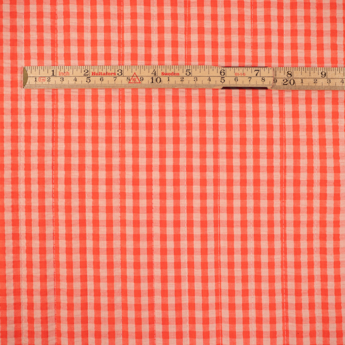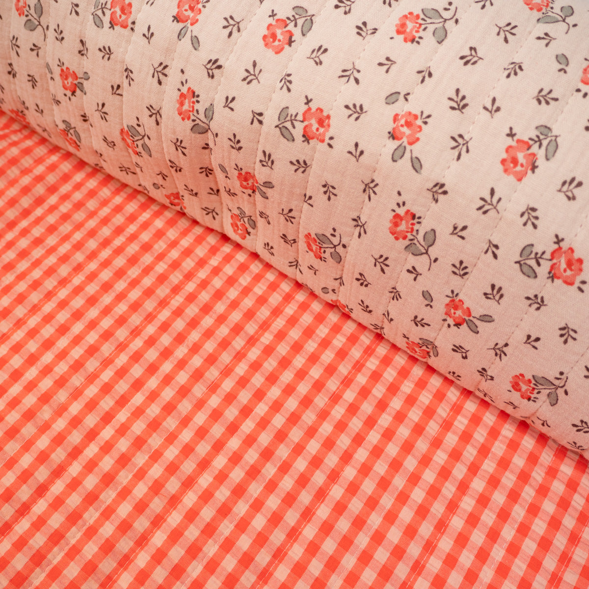 A very high-quality fabric, comfortable and soft, warm, perfect for making vests, jackets, blankets, crib bumpers, and sleeping bags. This fabric is reversible. One side features a floral print and the other a gingham pattern. The quilting is vertical.