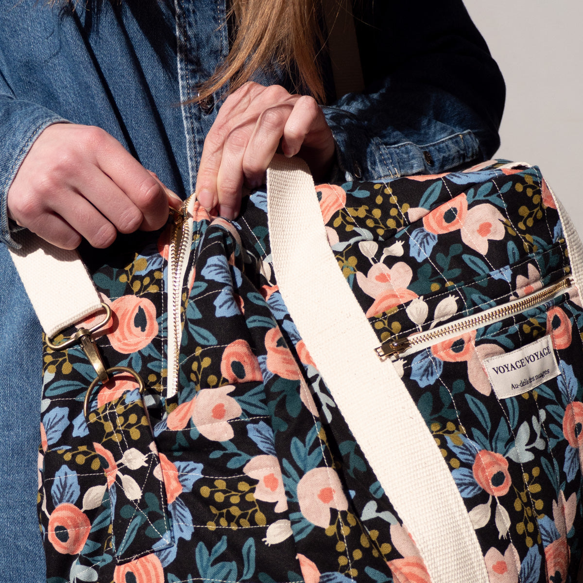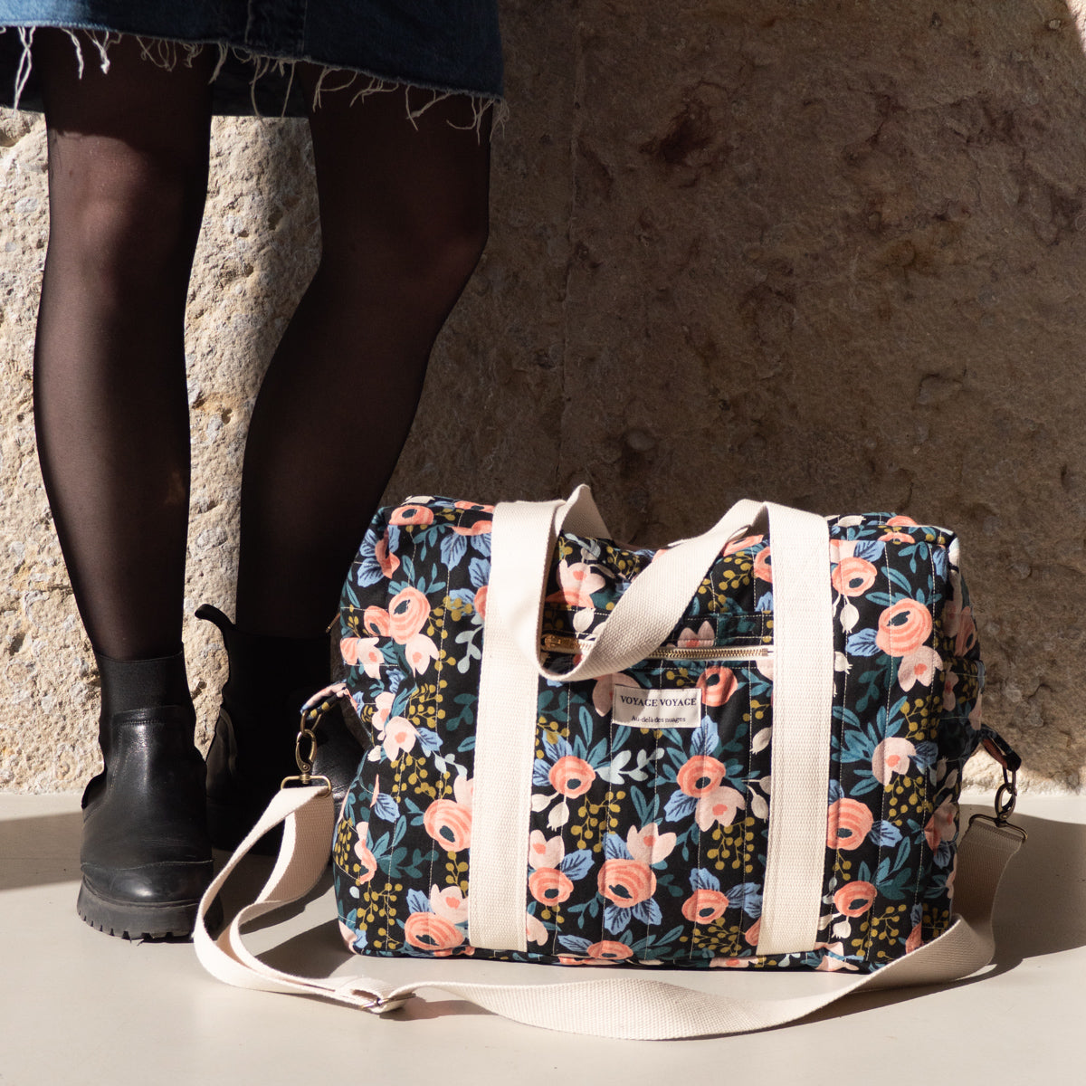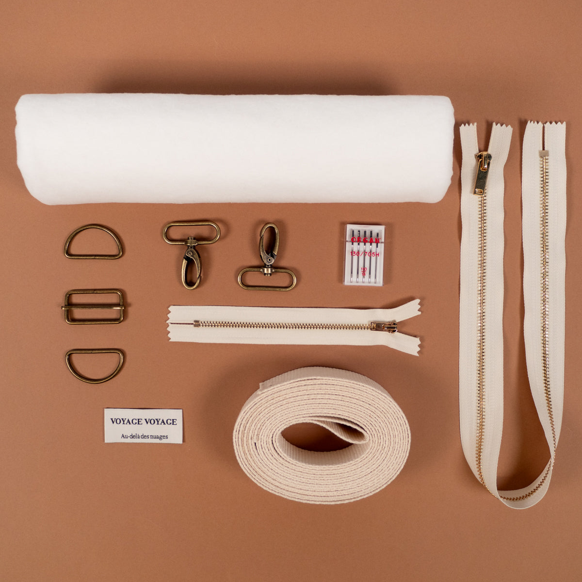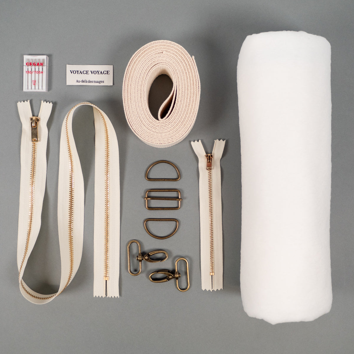 Retrouvez ici toute la mercerie nécessaire pour coudre un sac de ville, de week-end, sac à langer ou une trousse de toilette : entoilage, fermetures à glissières, fils, sangle, boucles, mousquetons et aiguilles. Notre modèle de sac ou trousse Voyage est disponible ici. Pour le tissu, choisissez parmi les gabardines ou canvas, les jeans ou les matelassés. Retrouvez tous nos conseils pour coudre le patron Voyage.