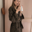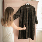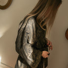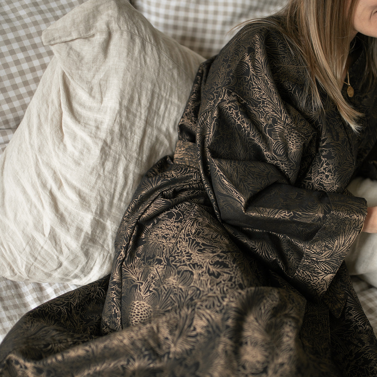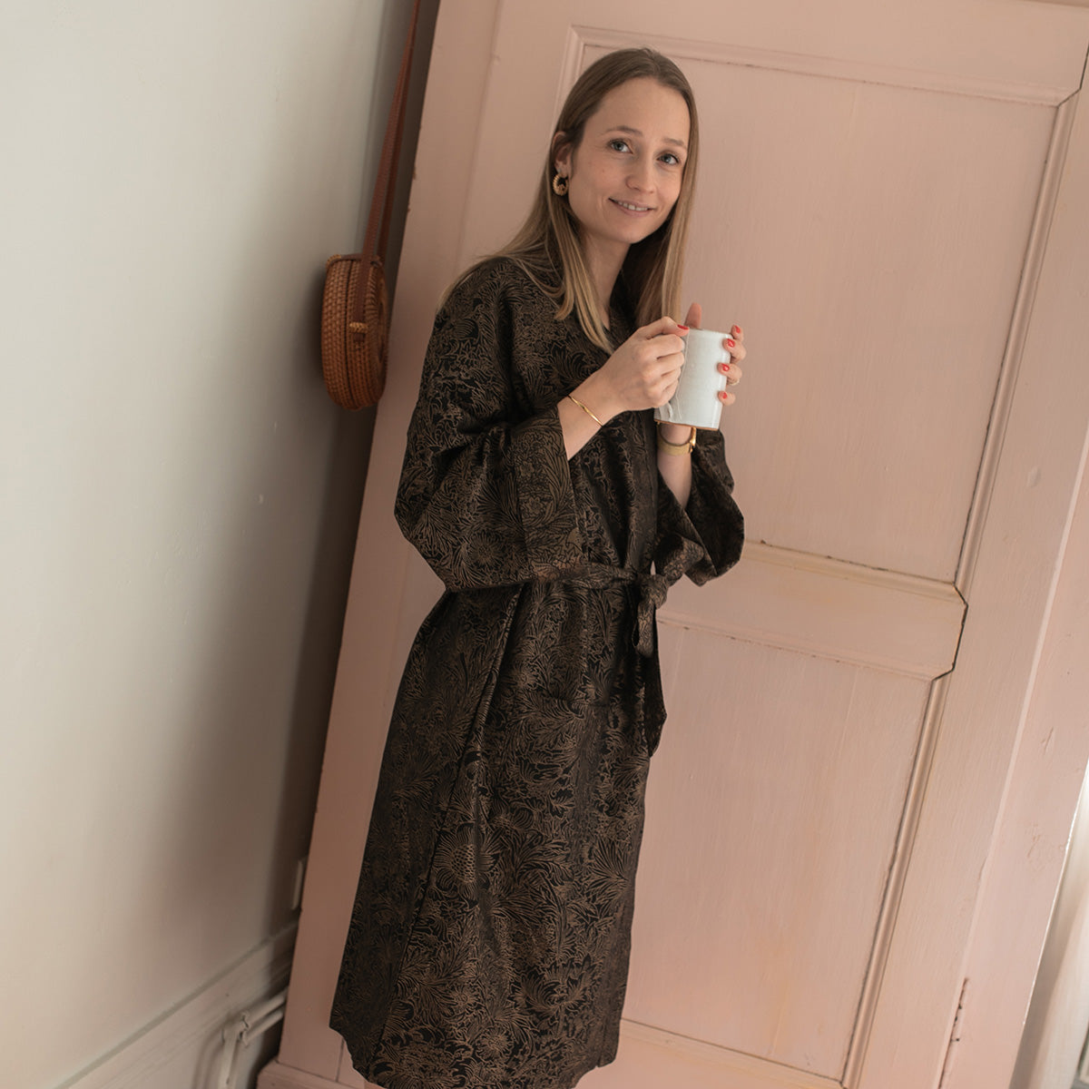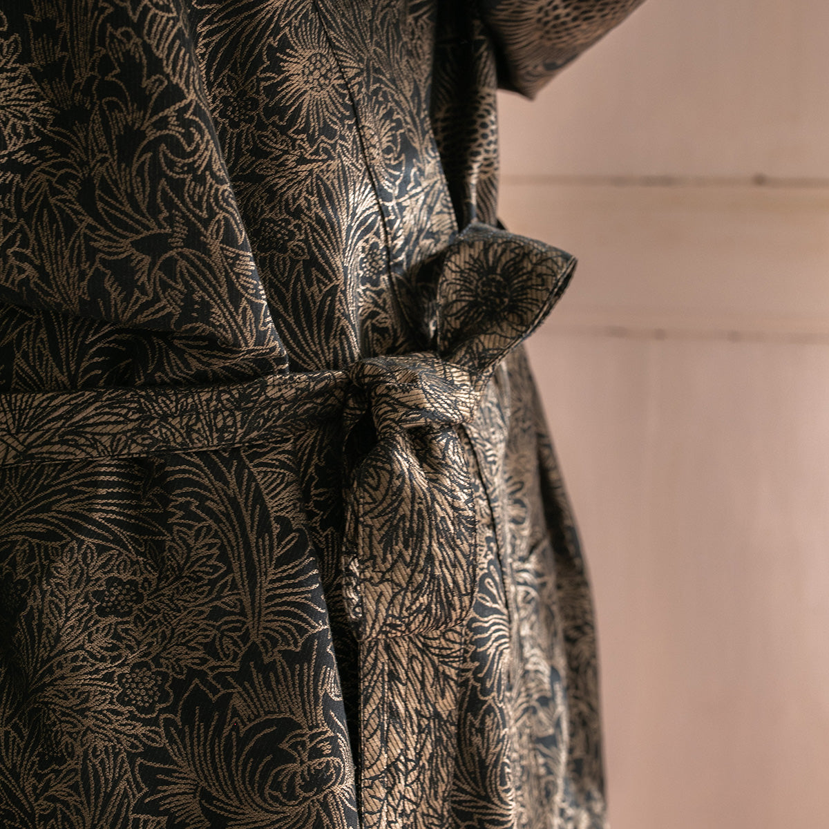 Coloris et motifs : Noir et bronze, aux reflets subtils selon la lumière. Fleurs tissées, visibles sur les deux faces