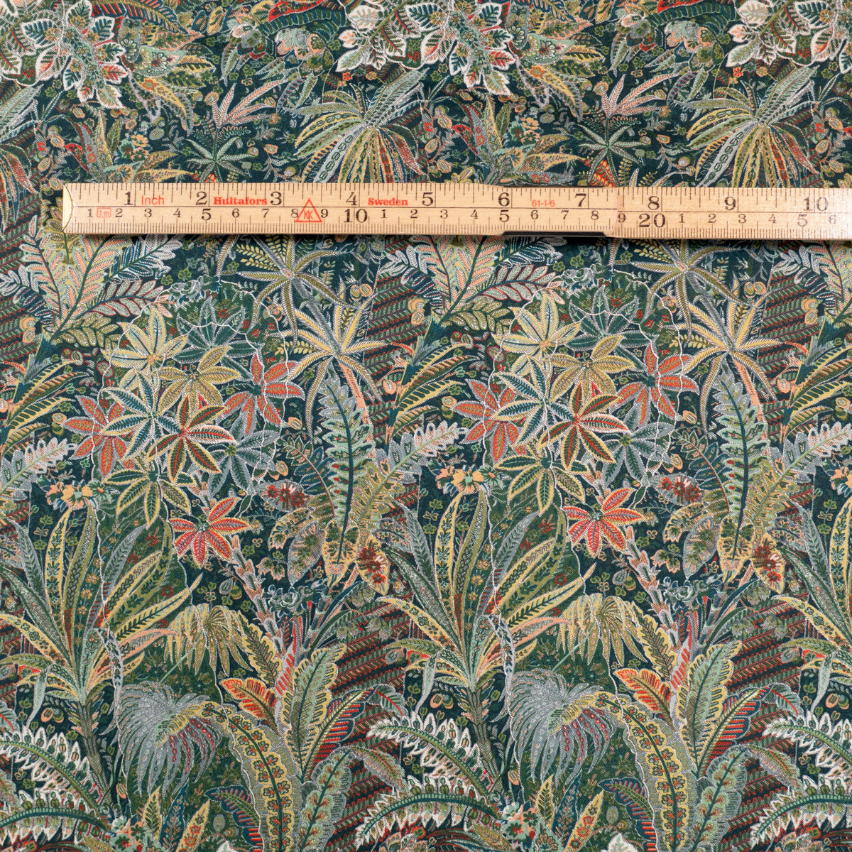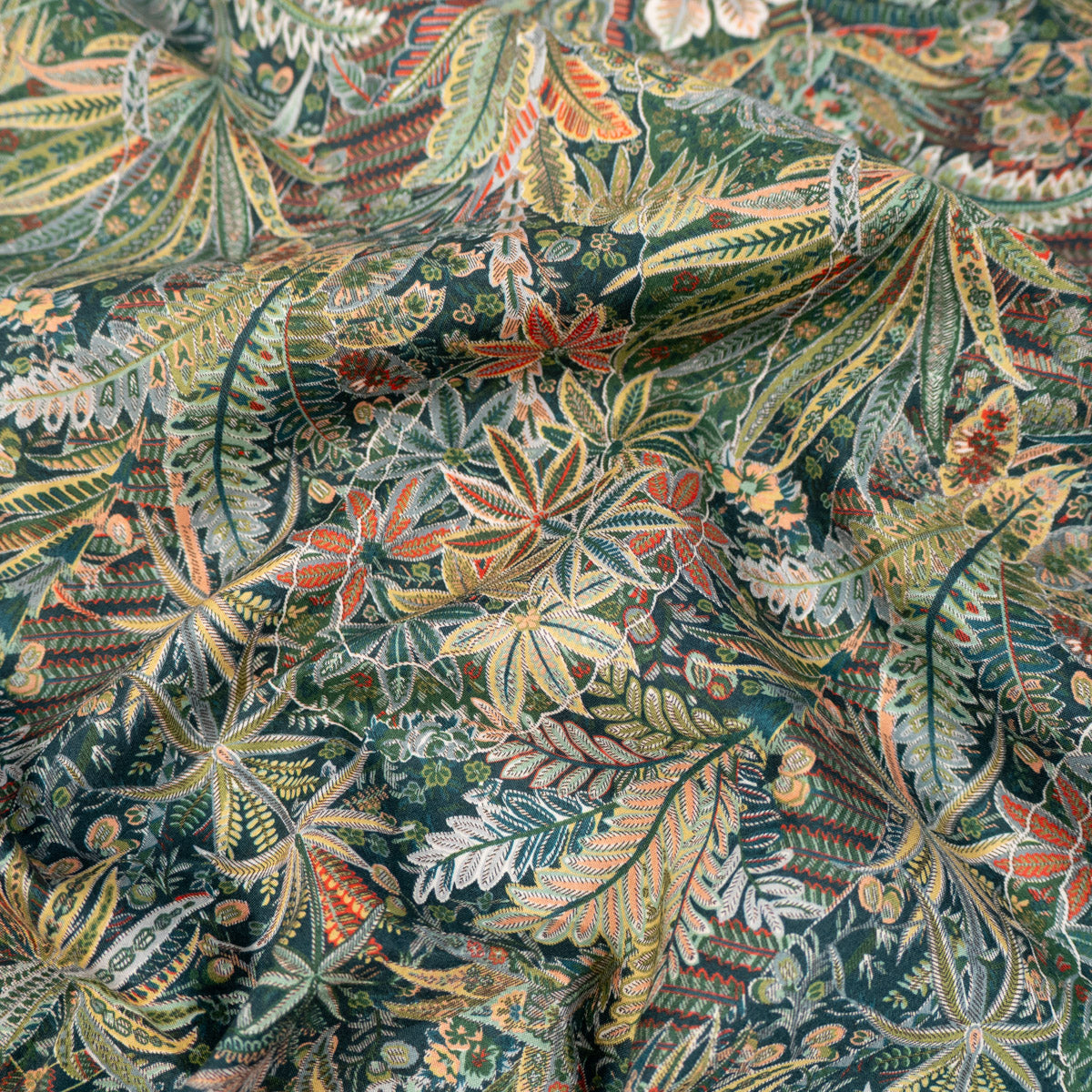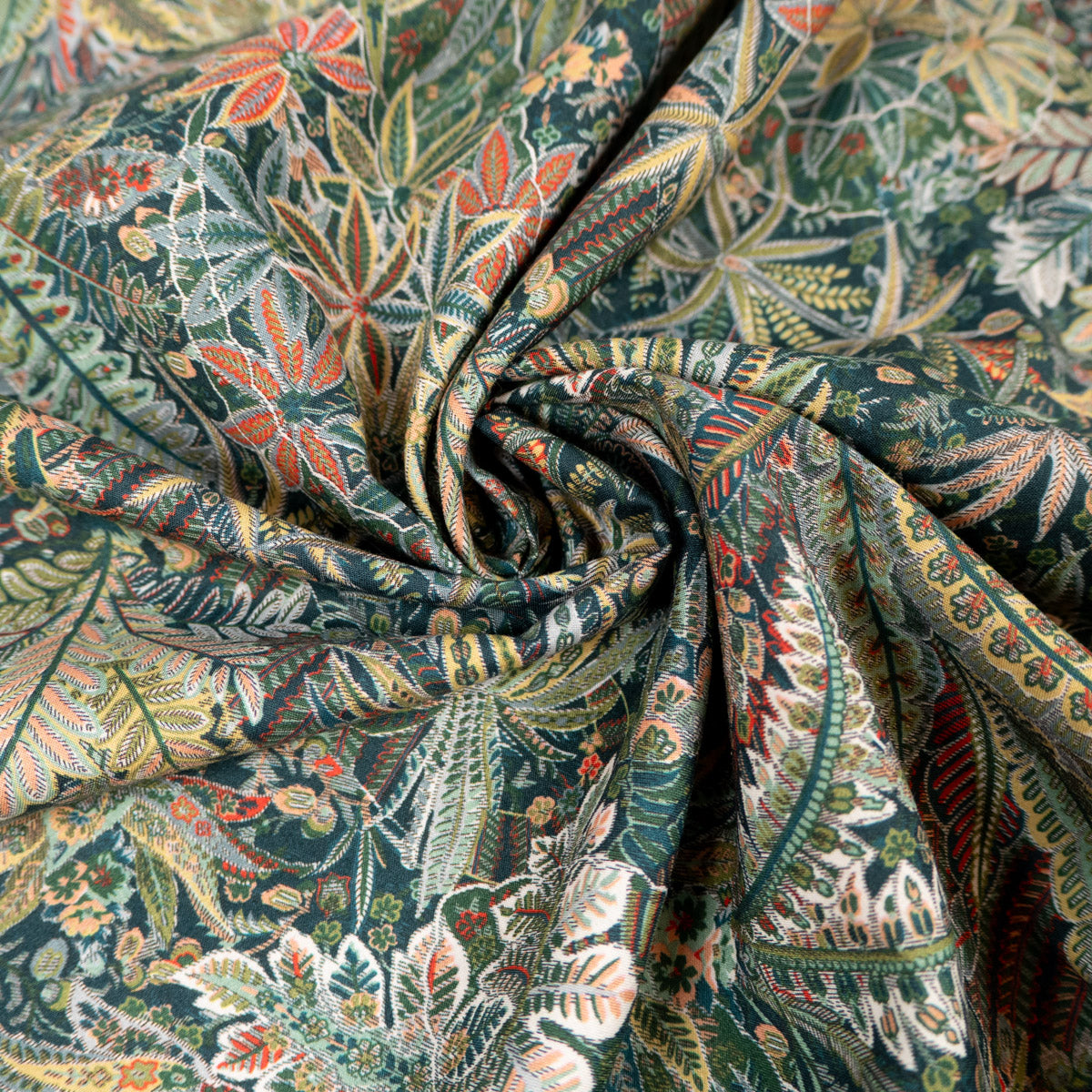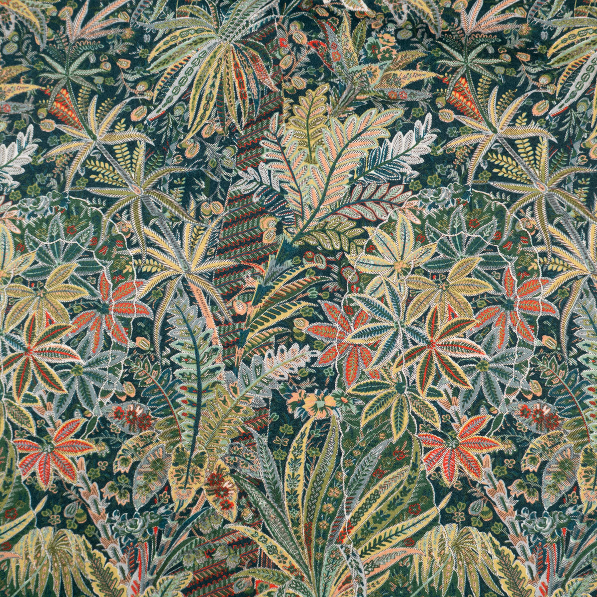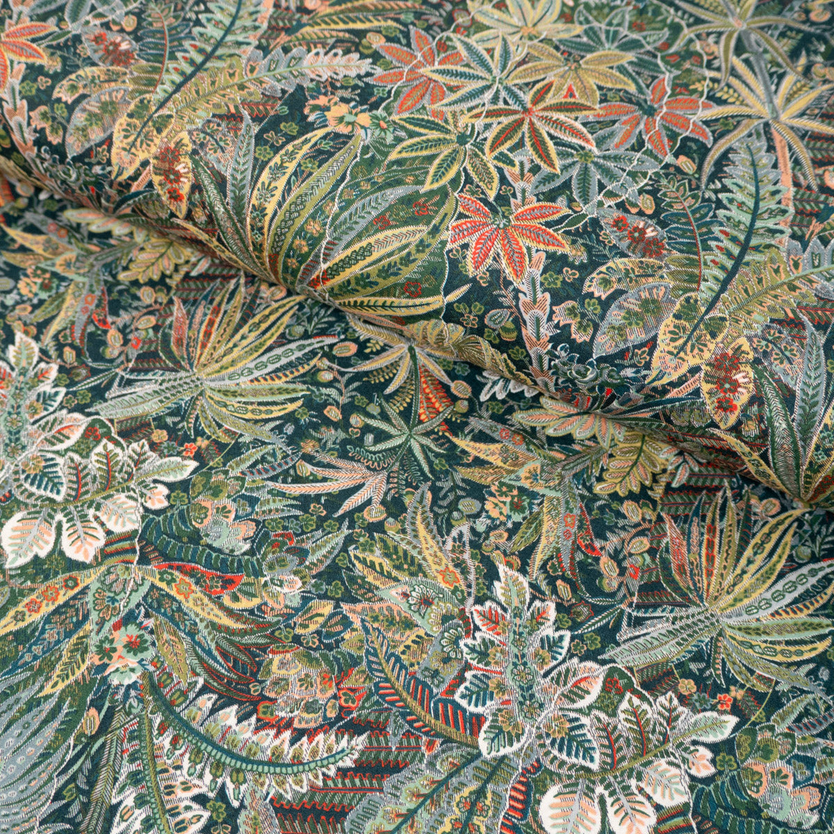 Coloris et motifs : Motif végétal dense et raffiné, aux accents exotiques, mêlant feuillages stylisés et fleurs délicates dans une palette de verts profonds relevée de touches corail et écru.