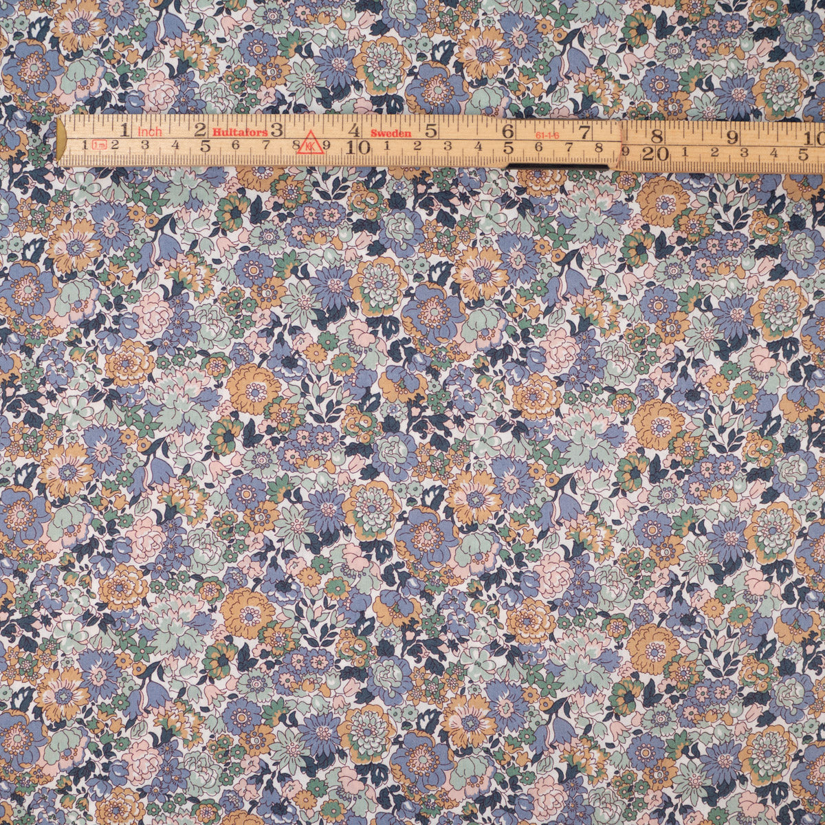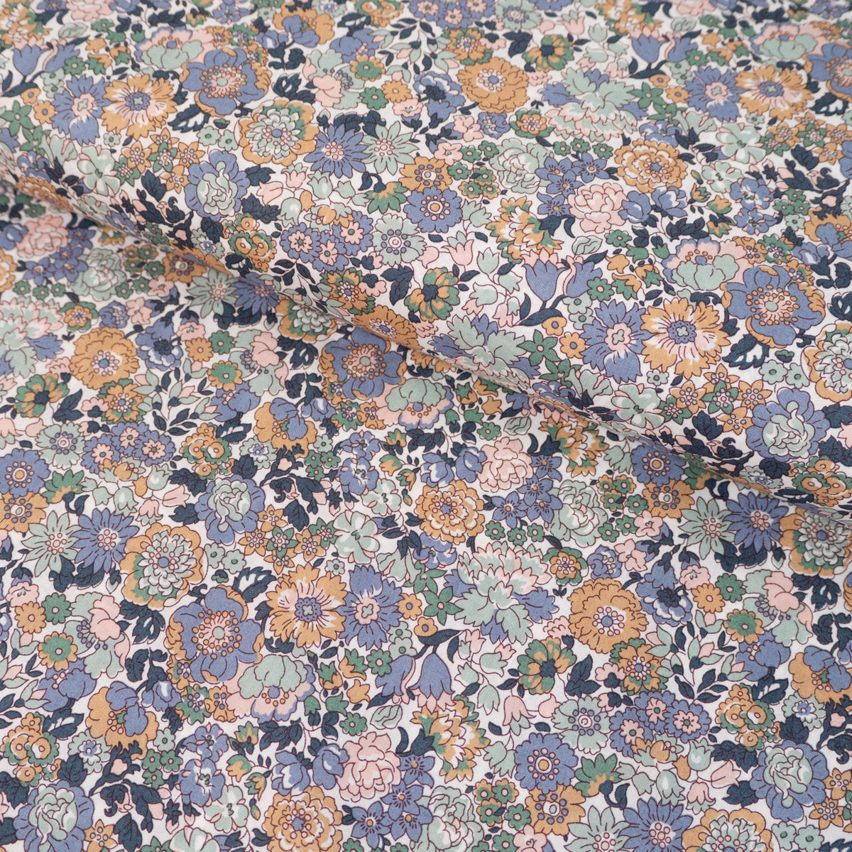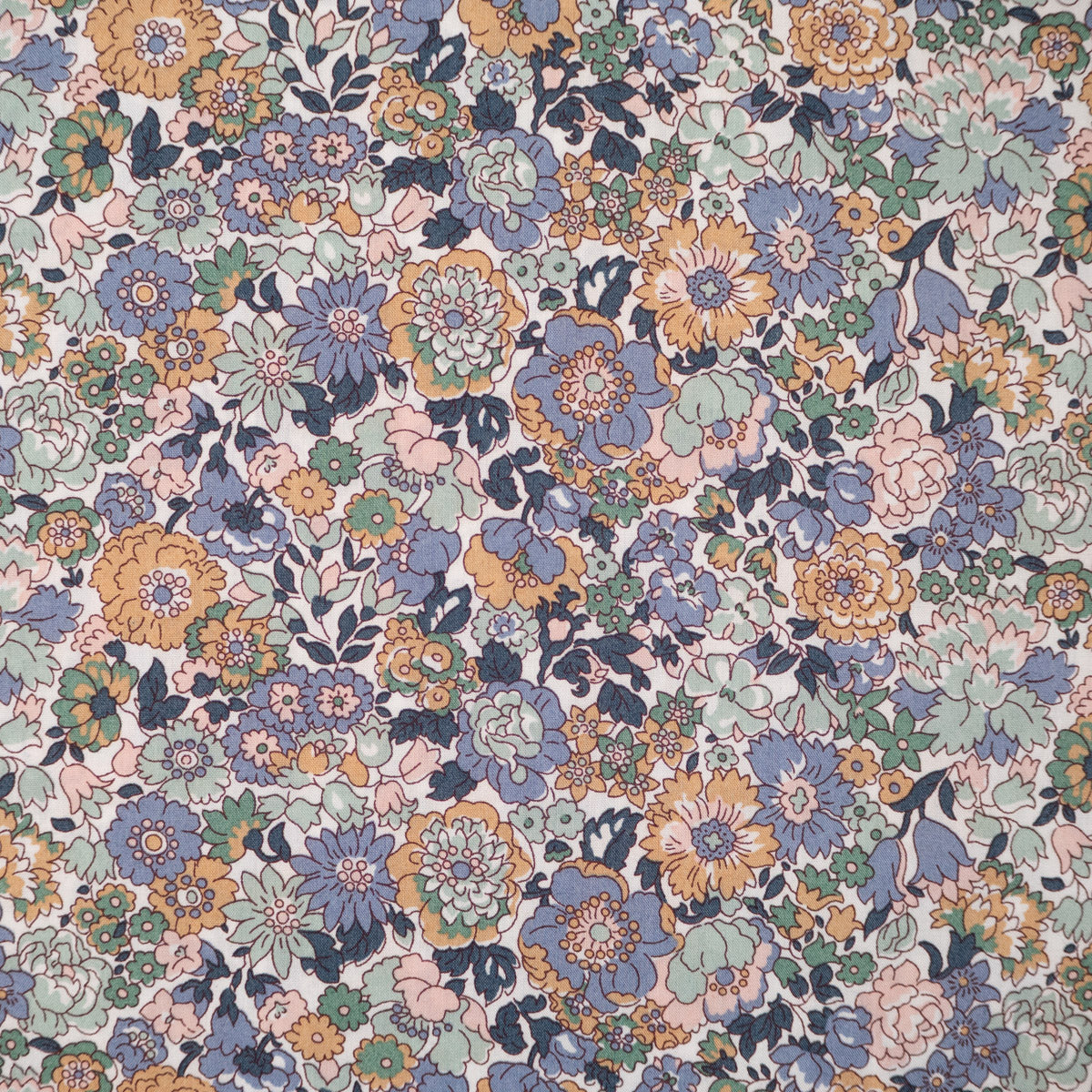 Coloris et motifs : Motif floral dense de petites fleurs multicolores (bleu, vert d'eau, moutarde, rose) sur fond blanc.