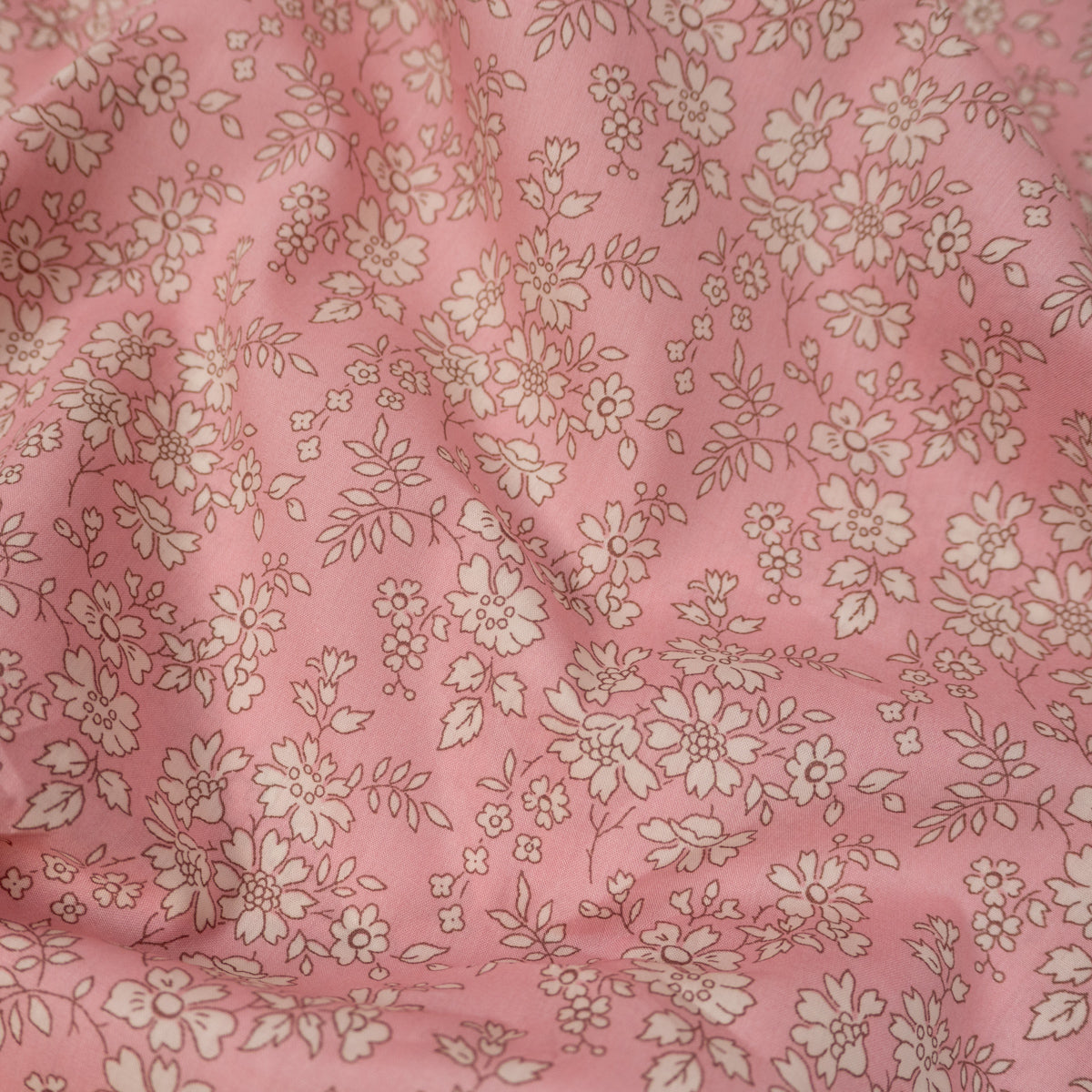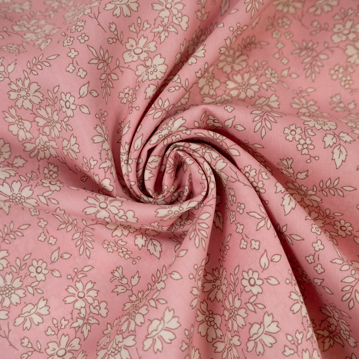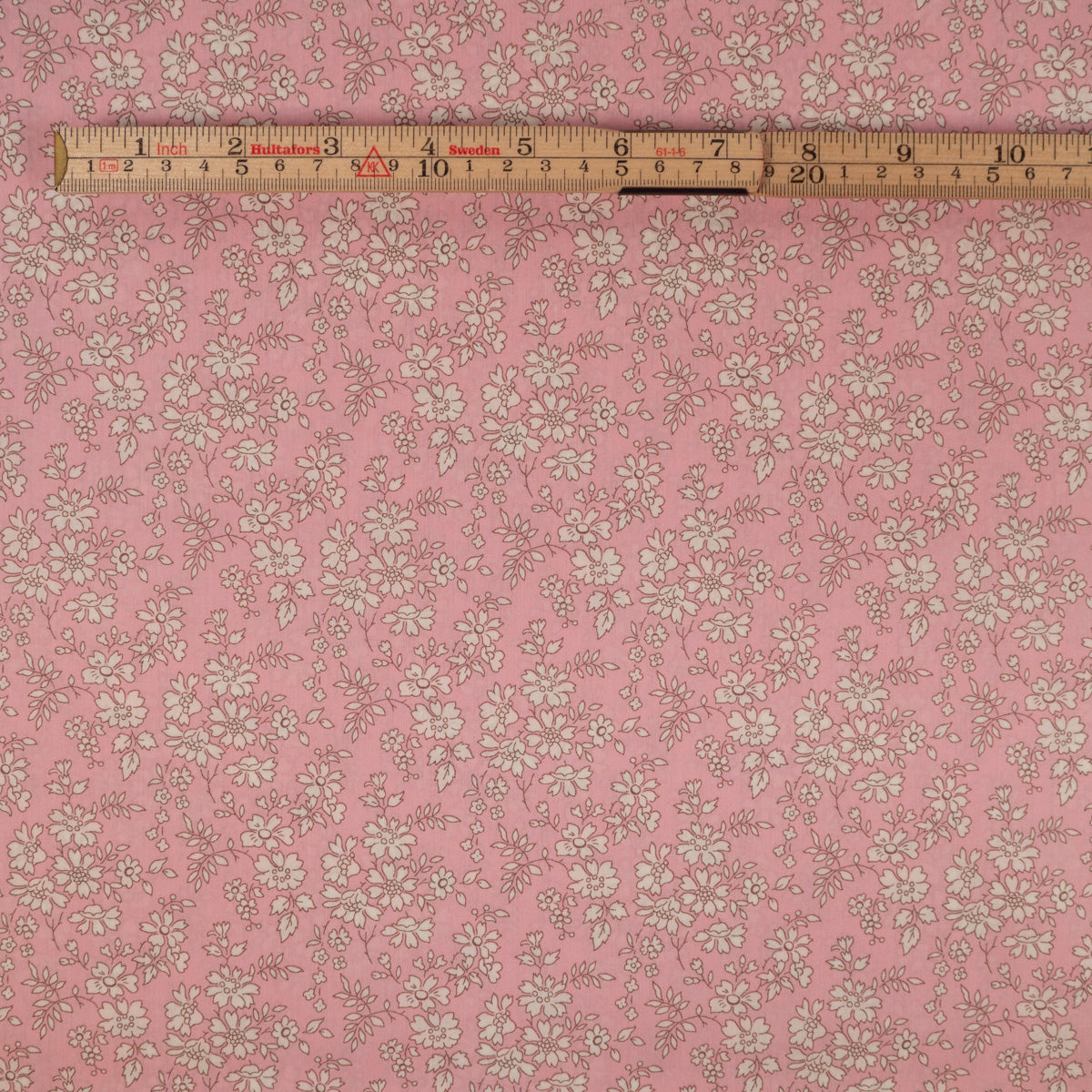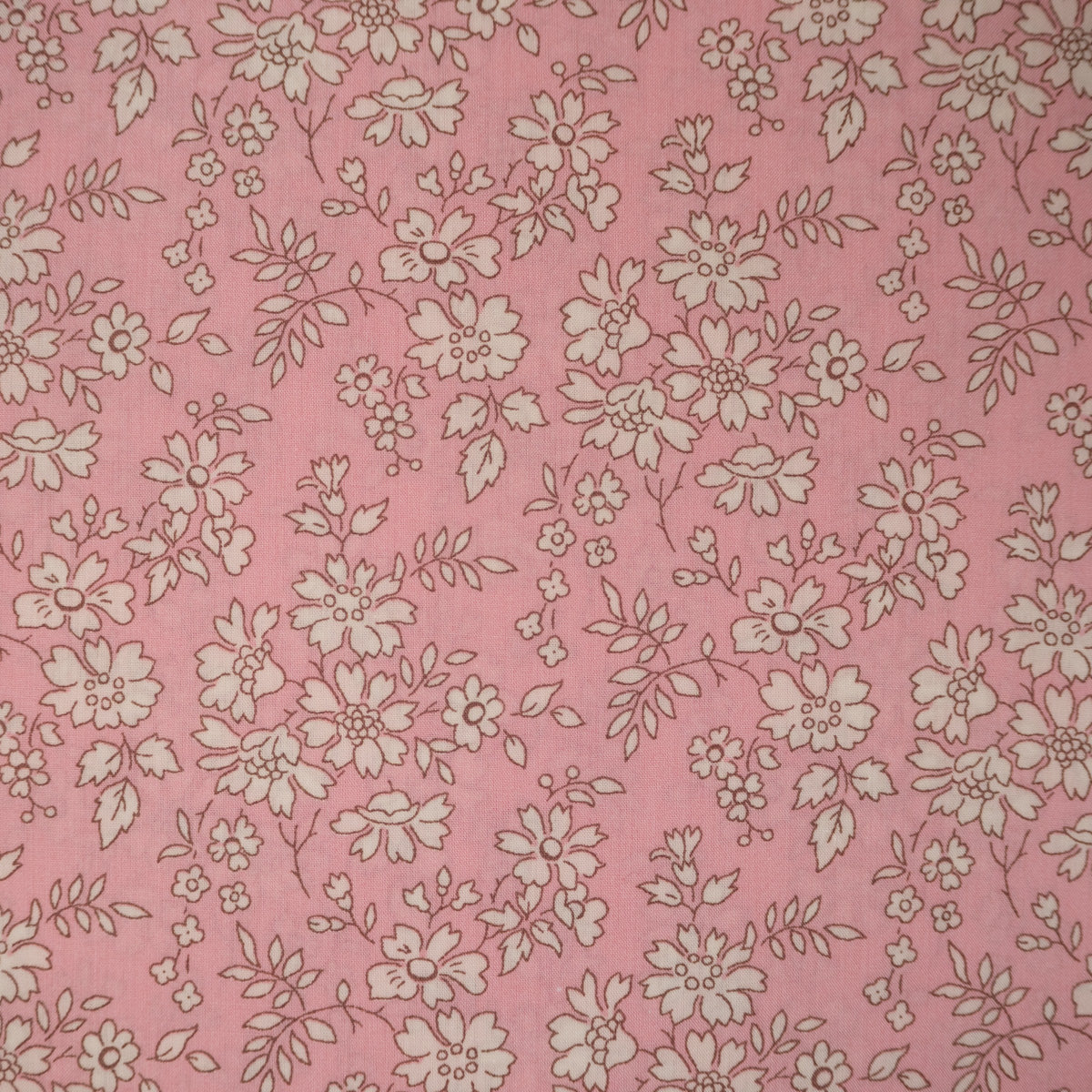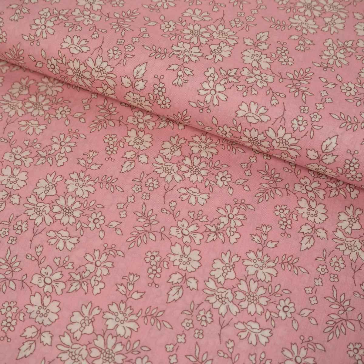 Coloris et motifs : Motif de petites fleurs blanches délicates et feuillages fins, répartis de façon dense sur fond rose.